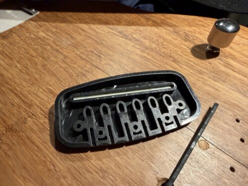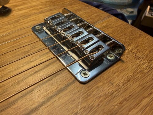 Was an der Gitarre von Anfang an nervte, war, dass sie nicht ganz bundrein war. Für die Laien: Im 12. Bund (das sind diese abgetrennten Rechtecke am Hals der Gitarre, die immer enger werden), muss die Gitarre genau eine Oktave höher klingen. Bei E-Gitarren oder auch Bässen hat man i. d. R. Saitenhalter („Brücken“) mit etlichen Einstellmöglichkeiten. Neben der sogenannten Saitenlage (Höhe der Saite über dem Griffbrett) kann man die klingende Länge einstellen und damit die Bundreinheit. Bei Westerngitarren (die Klappgitarre ist im Prinzip eine Westerngitarre, also akustisch mit Stahlsaiten) hat man diese Einstellmöglichkeiten meistens nicht, sondern in der Brücke nur eine Stegeinlage, die nach Erfahrungswerten die klingende Länge der Saite einstellt. Das passte nun hier nicht so richtig. Spätestens als meine Musik-Freundin Kathrin gerechtfertigt die Nase rümpfte, war endgültig Handlungsbedarf. Also beschloss ich, die Plastikbrücke gegen eine E-Gitarrenbrücke auszutauschen. Die war schnell bestellt und geliefert, hatte aber einen Haken, den ich erst nicht gesehen hatte, dazu später.