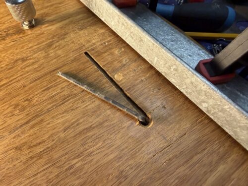 Ich hatte auch probiert, ob es vielleicht ohne Fenster und Alublech geht: Dann werden aber nicht genug Schwingungen auf den Tonabnehmer übertragen. Deswegen die Fräsung. Ich hab also nicht gleich zur Oberfräse gegriffen, sondern erst mal probiert. Die diversen Löcher (und ein langer Riss in der Decke, der dort von Anfang an drin war) habe ich mit einem Gemisch aus Sägemehl und Sekundenkleber aufgefüllt. Dann ist mir noch eine Schraube abgerissen, die ich herausoperieren musste. Aber jetzt funktioniert alles. Im Übrigen musste ich schon zuvor das Ausgangssignal des Tonabnehmers mit einem Widerstand abschwächen, da die Gitarre am „cleanen“ Verstärker leicht verzerrte. Den Widerstand hatte ich erst wieder ausgelötet, als ich die ungefensterte Brücke probeweise montiert hatte. Da war das Signal aber dennoch zu schwach, mit dem Aluteil, ohne Widerstand aber zu stark. Außerdem hab ich auch irgendwann einen Vorverstärker mit Klangregelung eingebaut. Ich weiß schon gar nicht mehr, wo ich den herhabe. Vorher konnte man nur laut und leise drehen. Jetzt kann man auch Bässe und Höhen getrennt regeln. Alles in allem eine gut spielbare und ok klingende Reisegitarre ist es nun geworden. Nur, dass ich ja praktisch nicht mehr reise. Aber irgendwas ist ja immer.